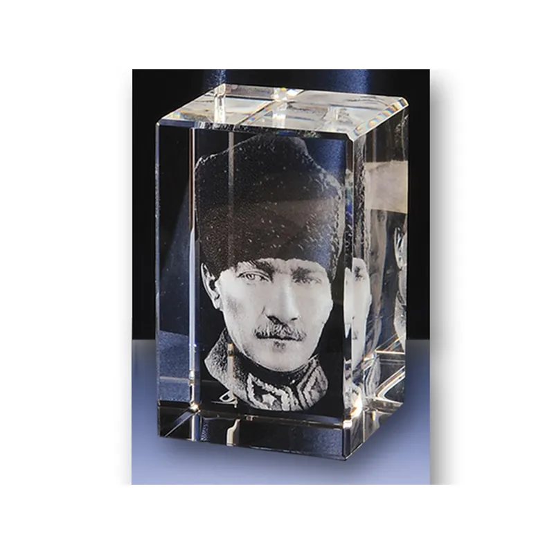 Atatürklü Kristal Küp Özellikleri: Atatürk görseli 3D olarak tasarlanmaktadır, kristal küp içerisine lazer patlatma tekniği uygulanarak üretimi sağlanır. Atatürk dışındaki görseller 2D olarak küp içerisine işlenebilir.