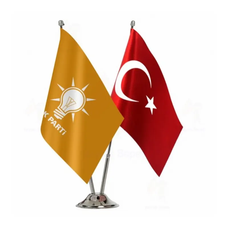 AK Parti Masa Bayrakları İmalatı: Merkezi Ankara’da bulunan bayrak üretim ve imalat tesislerimizde parlak saten kumaş üzerine talebe göre tek taraflı veya çift taraflı yüksek kalitede serigrafi veya transfer baskı uygulanarak üretilir.