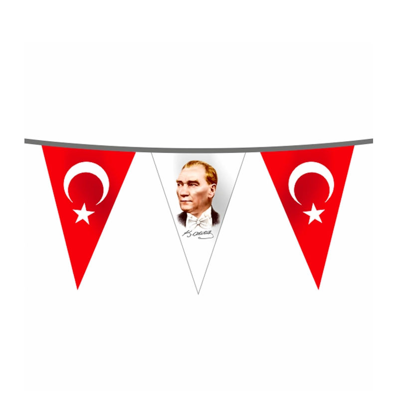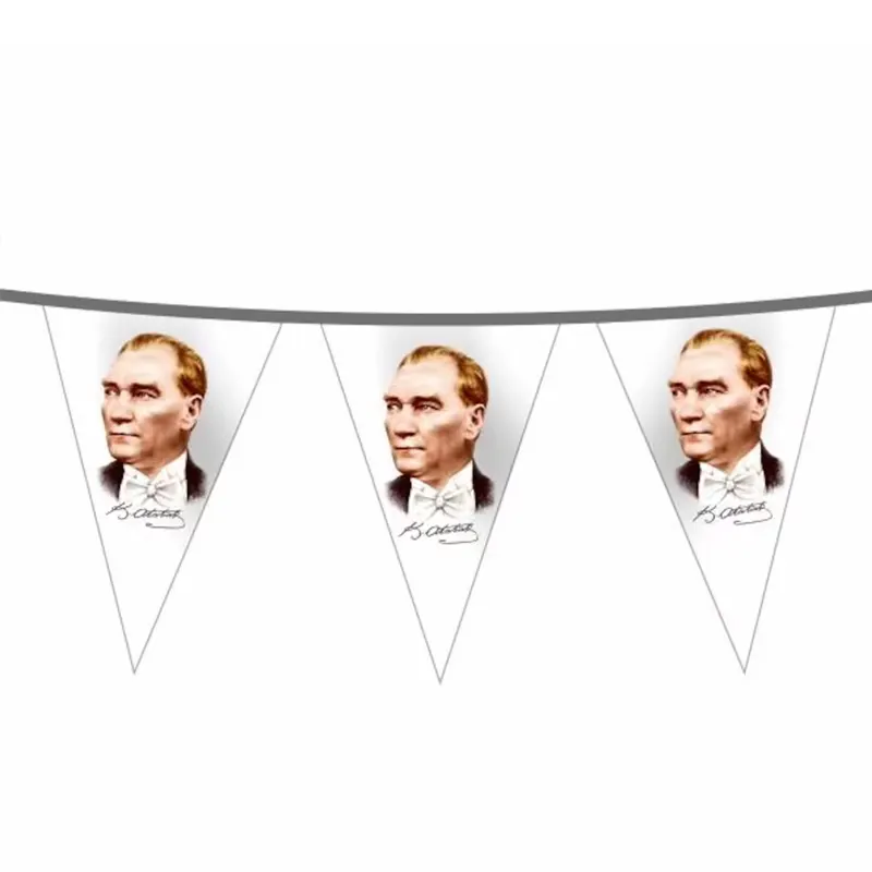 Atatürk Baskılı İpe Dizili Bayrak, Mustafa Kemal Atatürk’e ait bir görselin üçgen veya dörtgen formundaki bayraklara basılması ve uzun ipler üzerine belirli sayılarda yerleştirilmesi ile kullanıma hazır hale getirilen süsleme bayraklarıdır. Atatürk Baskılı İpe Dizili Bayrak, genellikle Türk bayrağı renkleriyle uyumlu bir şekilde dizayn edilmiş özel bir tasarıma sahiptir. Atatürk Baskılı İpe Dizili Bayrak, genellikle resmi törenlerde, anma etkinliklerinde, özel gün ve kutlamalarda kullanılarak Türkiye’nin bağımsızlık ve modernleşme ideallerini simgeler.