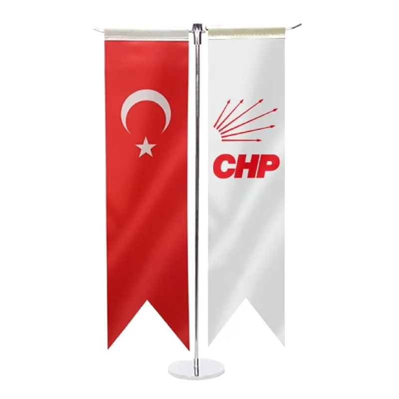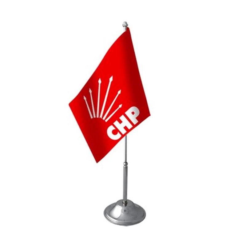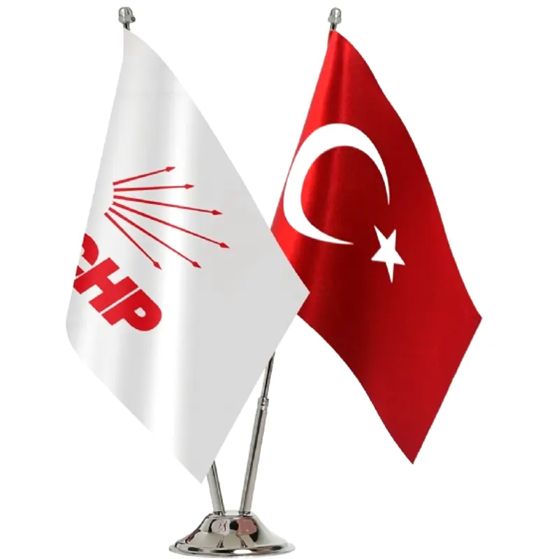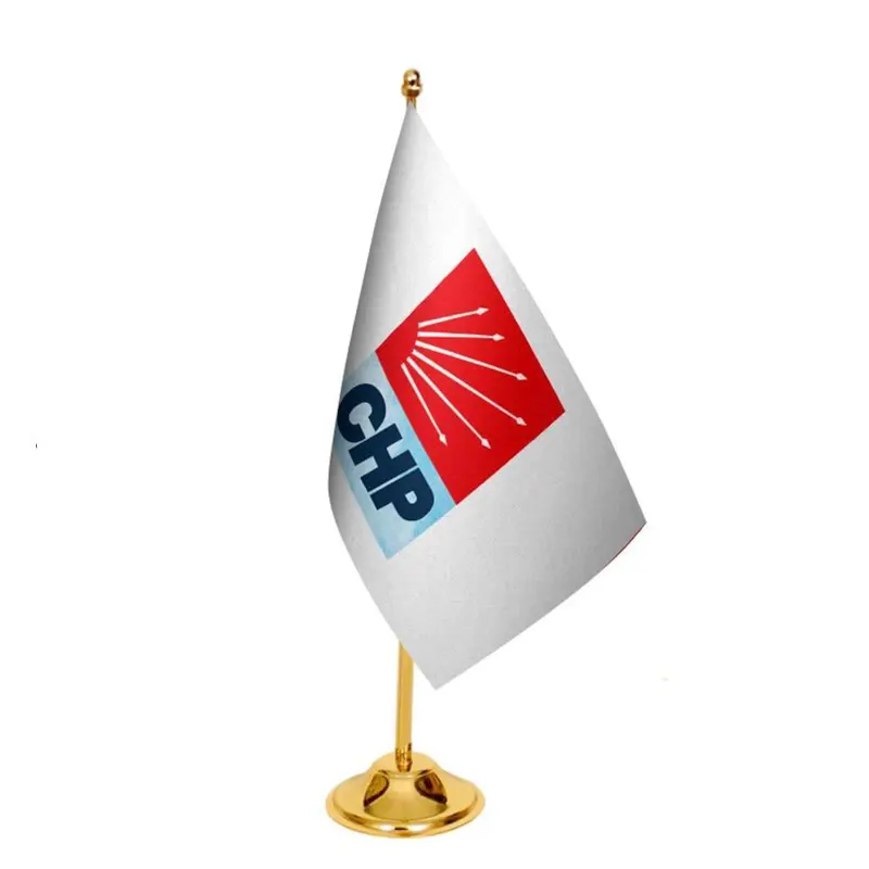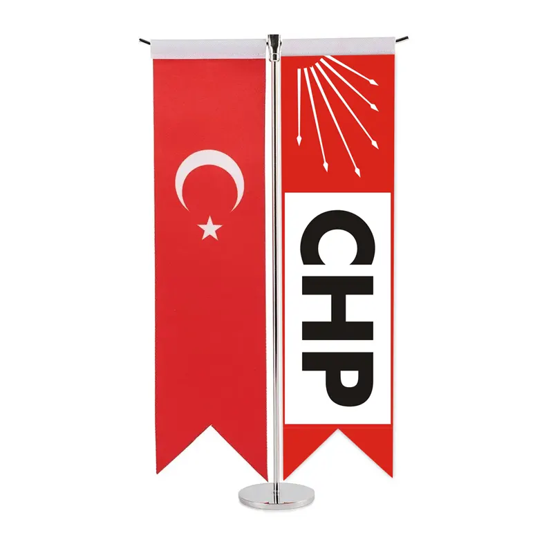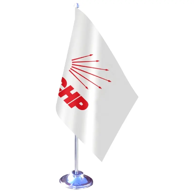 CHP Masa Bayrakları İmalatı: Merkezi Ankara’da bulunan bayrak üretim ve imalat tesislerimizde parlak saten kumaş üzerine talebe göre tek taraflı veya çift taraflı yüksek kalitede serigrafi veya transfer baskı uygulanarak üretilir.